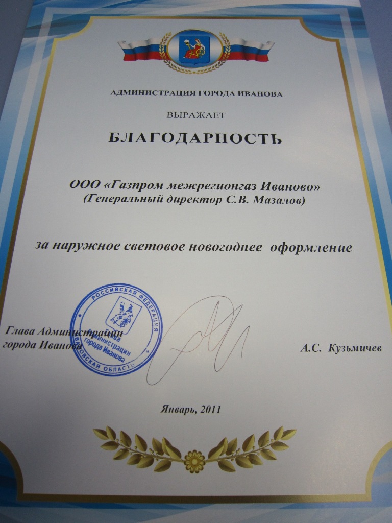 Глава администрации города Иванова Александр Кузьмичёв выразил благодарность ООО «Газпром межрегионгаз Иваново» за наружное световое оформление здания компании к Новому году