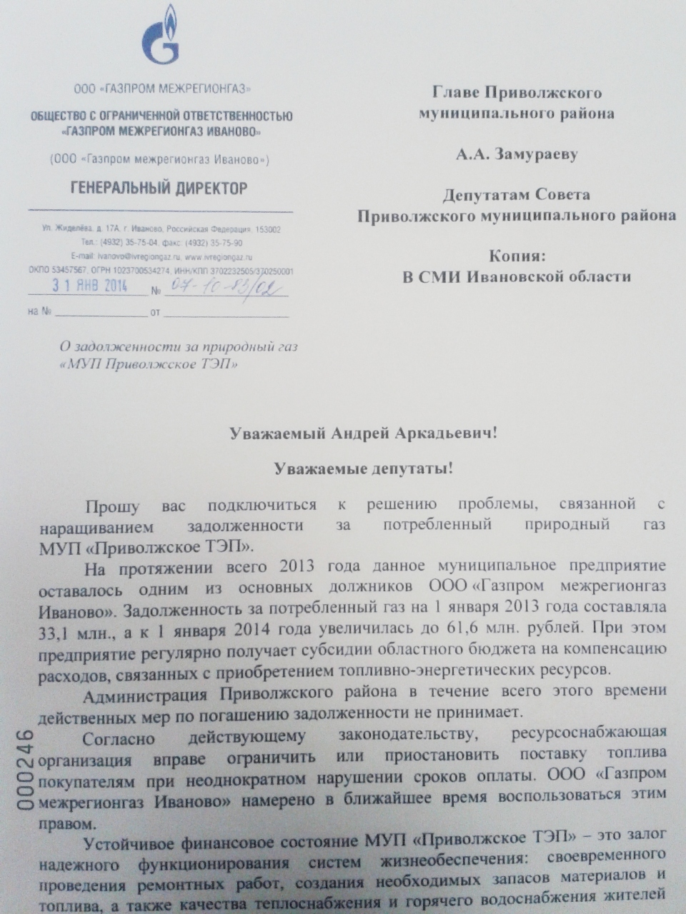 Прошу вас подключиться к решению проблемы, связанной с наращиванием задолженности за потребленный природный газ МУП «Приволжское ТЭП».